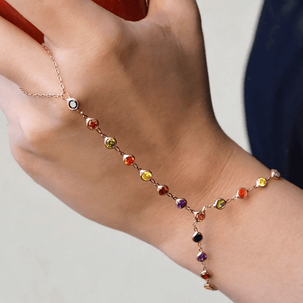 This beautiful hand chain is crafted from sterling silver and features a dainty chain. The centerpiece of the chain showcases a stunning heart-shaped zircon gemstone, exuding a casual yet sophisticated vibe....