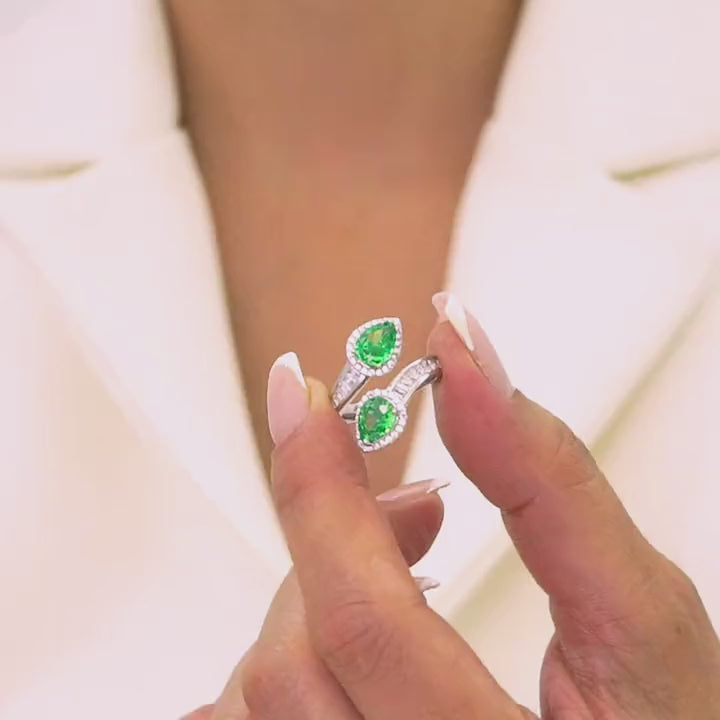Two vibrant green CZ stones are beautifully cut in a teardrop shape, adding a touch of elegance to this trendy open ring. Let your style speak volumes with this playful and eye-catching statement piece!